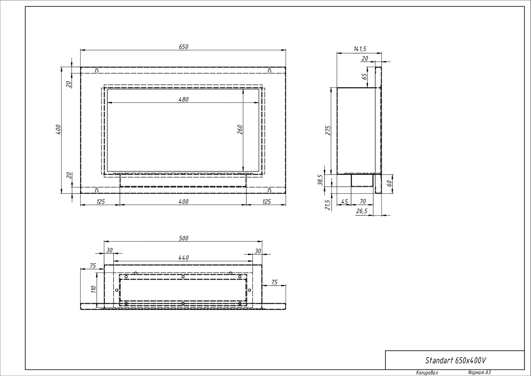 Встраиваемый биокамин «Лофт 650V» изготовлен из стали и нержавеющей стали, окрашен термостойкой порошковой краской.